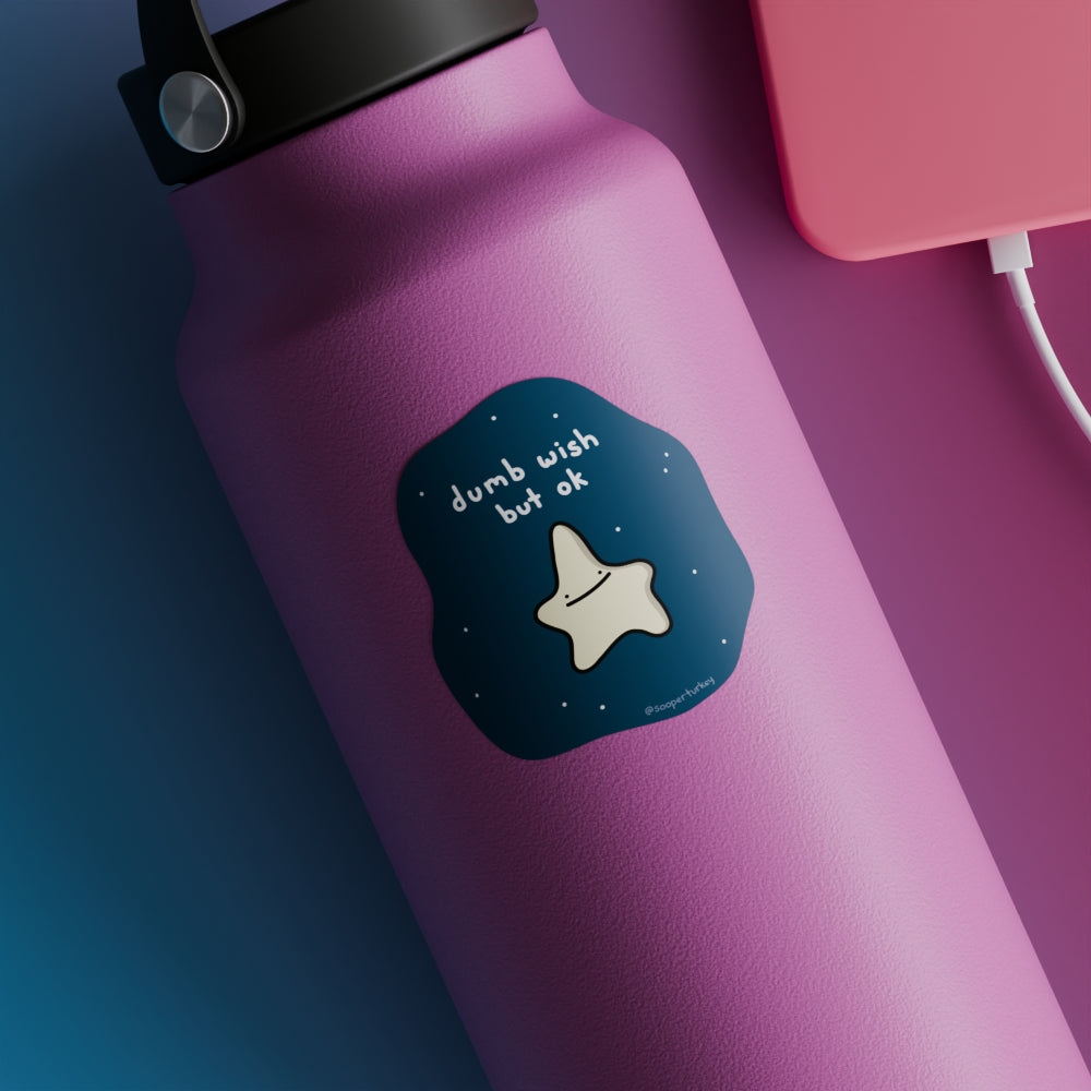 Thick, durable vinyl sticker is scratch resistant, and weatherproof. Stick it on your car, your laptop, your eco-friendly water bottle, or anywhere you need a reminder of your dumb wish.